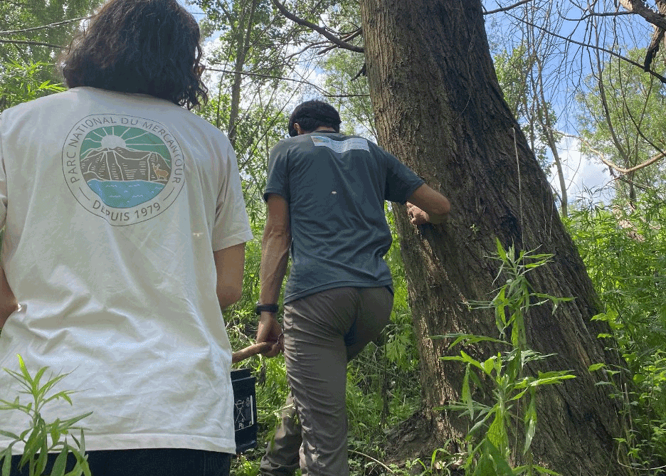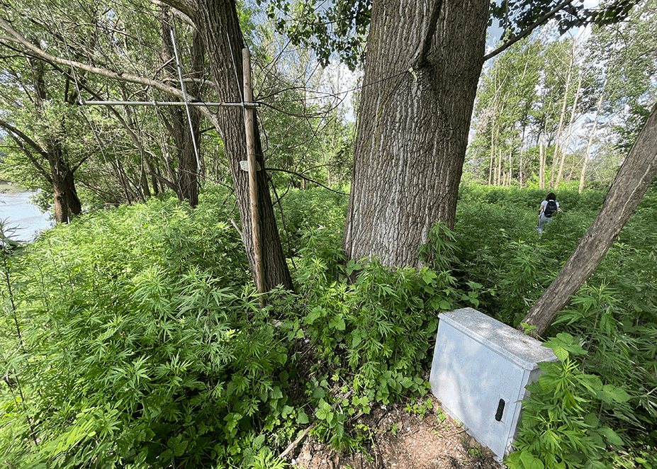 Carlo and Flavia pull the flat-bottomed boat to the river’s edge and tie it to a log. They carry the outboard engine from the vehicle to the shore. Besides replacing the batteries in the four fixed stations used to monitor tagged Wels catfish, boat tracking with a portable receiver and antenna is carried out. Both operations are performed weekly. The portable device/antenna provides finer localization by allowing triangulation of tag positions. Discussion turns to the tagged fish: some may have moved downstream below the dam, others could have died or been caught. One individual, tagged at 90 cm the previous year, is now likely over a meter. If it is still there, it means that for fish of that size, the dam’s fish ladder doesn’t work (Flavia says “fortunately”).