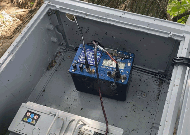 At the second station, the box is covered with ants. When touched, they release a pungent smell. Carlo brushes them off and installs the new battery, remarking that they have colonized the equipment quickly, perhaps attracted by the warmth or the electromagnetic field. The third station is partially overturned. A plastic sheet has been fixed over the box to keep out rainwater. The replacement battery is fitted, and the cover resecured. The fourth station lies near the point where the boat is moored.