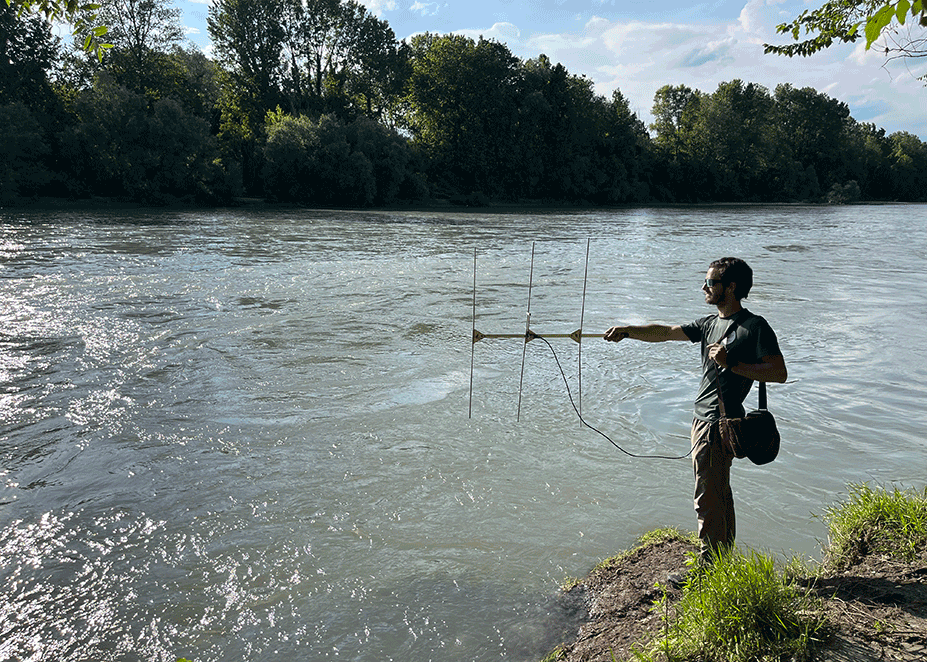 In this urban stretch of the Po River, located northeast of Turin and lying between two dams, radio telemetry allows researchers to study the movement of Wels catfish. Using automatic listening stations and weekly boat tracking, they map movements across the pre-reproductive and reproductive seasons, measuring linear range, travel between river reaches, day/night activity, and habitat preferences for each tagged fish. The study of Silurus glanis – the Wels catfish – is conducted as part of the Life Minnow project. The results are expected to be used to limit the spread of this non-native species, which is considered highly invasive in the Po basin.
